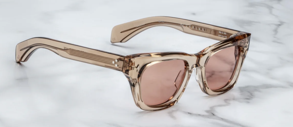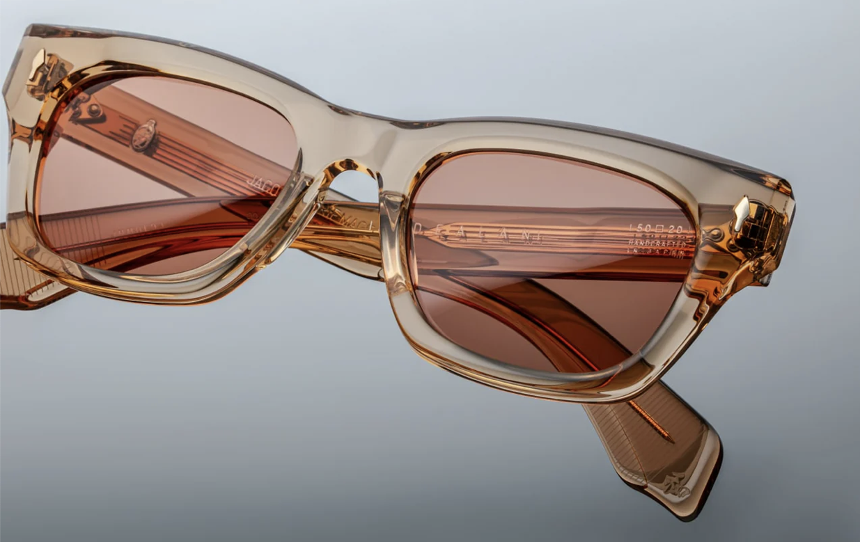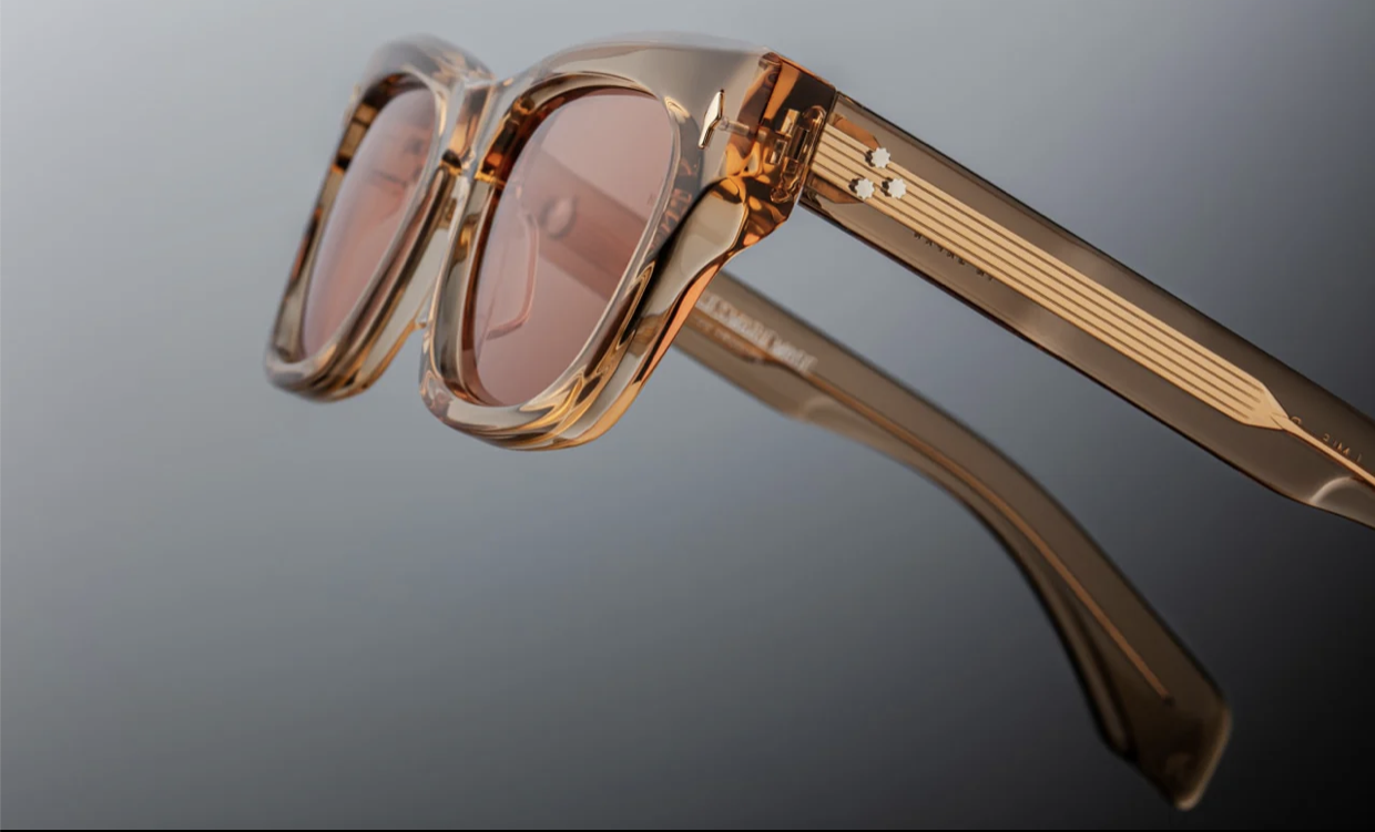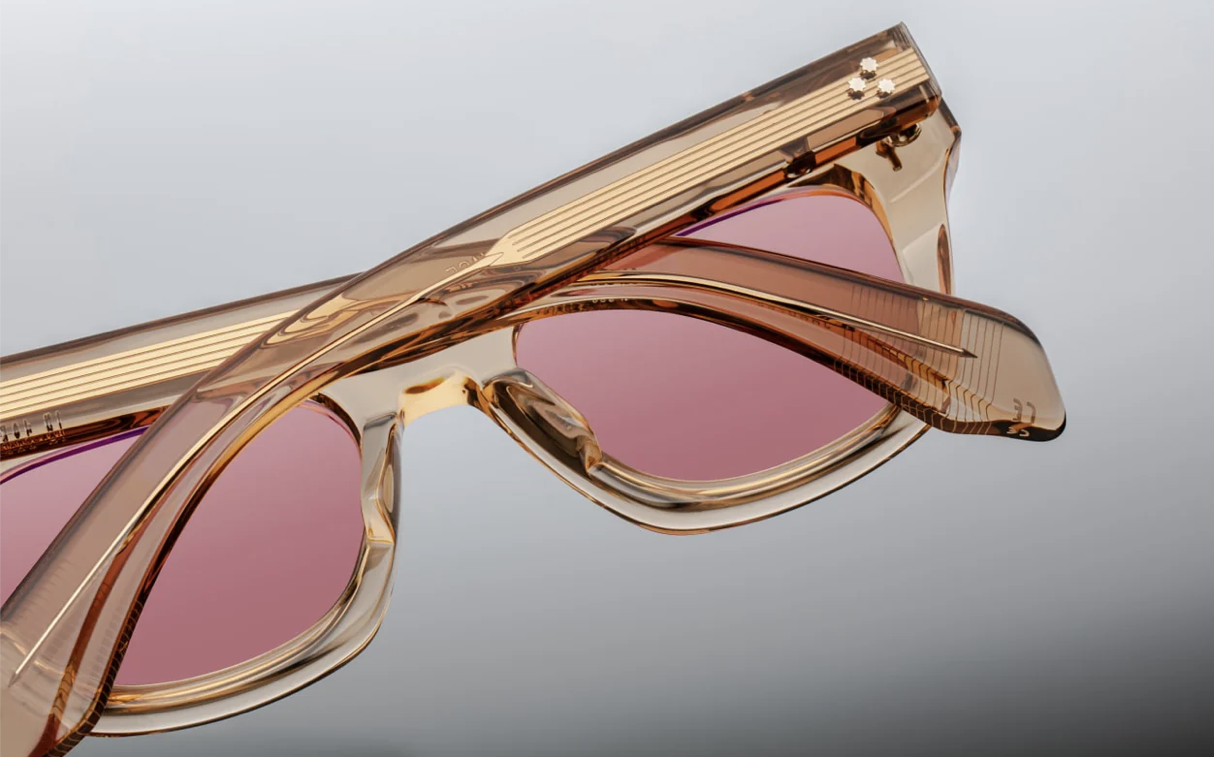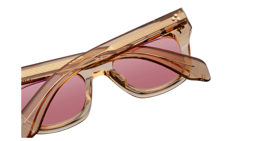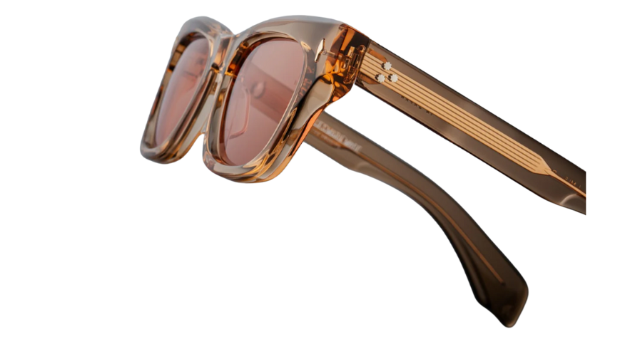 Iconic frame in 10 mm hardened beige cellulose acetate with custom double laminated acetate temples. Signature details include clear gold arrowhead front plaque, exposed clear gold wire core with custom engraving, and 7-barrel hinge in clear gold. Inspired by the iconic 1960s eyewear worn by Bob Dylan, combining bold volumes, clean lines, and timeless charisma. CR39 6-base lenses with anti-reflective treatment on the back.