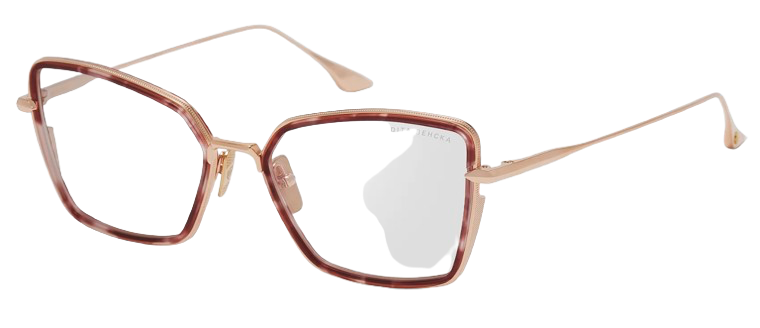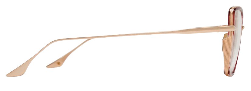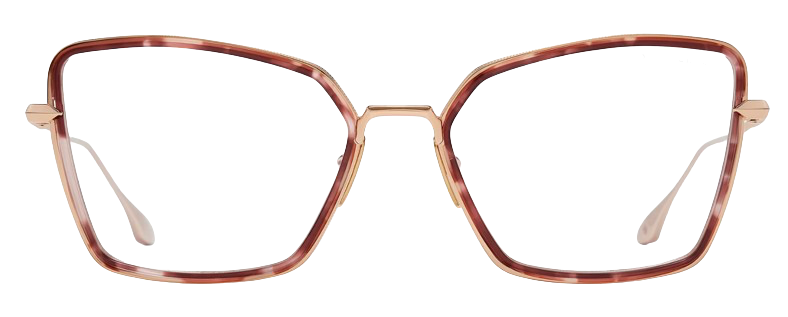 Monture Dita de forme carrée en acétate de cellulose, de couleur écaille rose, caractérisée par des matériaux sophistiqués et des branches en titane or rose.