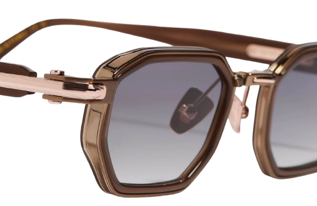 Le design se distingue par un pont avancé, intégrant des plaquettes de nez en titane reliées par un prolongement en métal. Les branches s’inscrivent dans la continuité naturelle de la monture et se terminent par un embout métallique. Leur travail de volumes, associé à de fines striures, apporte relief et caractère à l’ensemble.
