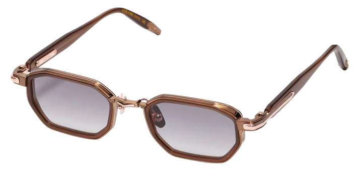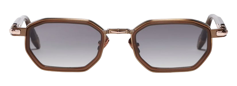 Monture mixte ronde, mêlant subtilement une structure en titane bronze à des finitions métalliques en or rose pour une alliance raffinée des matériaux.