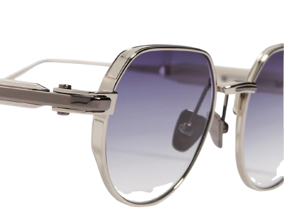 Le design se distingue par un pont avancé, intégrant des plaquettes de nez en titane reliées par un prolongement en métal. Les branches s’inscrivent dans la continuité naturelle de la monture et se terminent par un embout métallique. Leur travail de volumes, associé à de fines striures, apporte relief et caractère à l’ensemble.