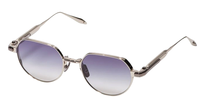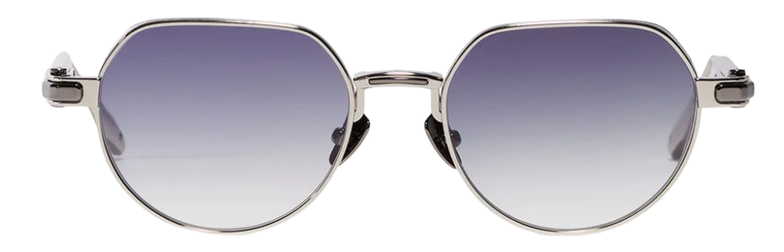 Monture mixte ronde de couleur platine, mêlant subtilement une structure en titane à des finitions métalliques pour une alliance raffinée des matériaux.