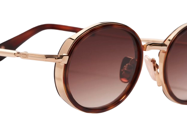 Les branches en acétate se prolongent naturellement vers des embouts métalliques sculptés, pensés comme le prolongement fluide de l’architecture de la monture. La structure centrale en titane est finie en or rose (5 µ), avec un poinçon de bijoutier discrètement apposé à l’intérieur de la branche. Les extrémités ainsi que les cercles de branches sont réalisés en acétate écaille brun foncé.