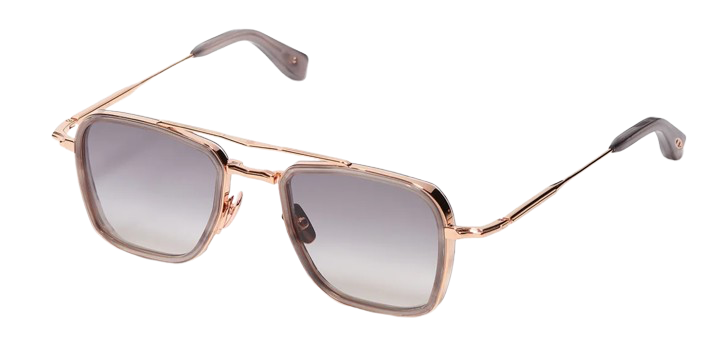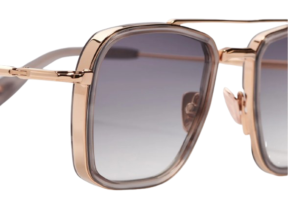 Monture solaire rose et gris de forme rectangulaire composée en titane avec des détailles métallique dans une fusion raffinée de matériaux. Les verres sont reliés par un pont en relief où les plaquettes sont fixées grace a une fine extension métallique. Les branches sont sculpté dans le métal sur plusieurs épaisseurs, elles mettent en valeur le caractère distinctif du design.