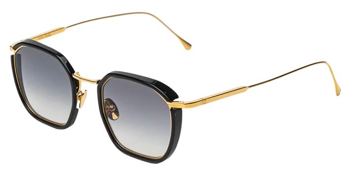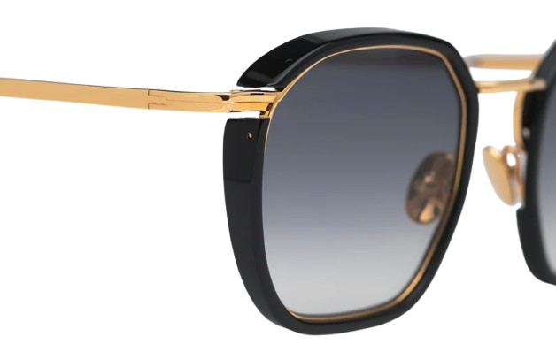 Medium-sized graphic frame for men, enhanced by a new geometric bridge and finished with classic temple tips. The frame is crafted from Infinite black acetate and 22-carat yellow gold–plated alloy, featuring an approximately 5-micron plating and a jeweler’s hallmark engraved inside the temples.