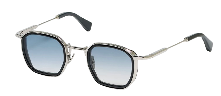 The frame is crafted from a custom alloy, plated with Infinite Black acetate and ruthenium (approximately 3 microns), creating a refined contrast and premium finish.
