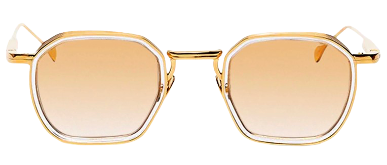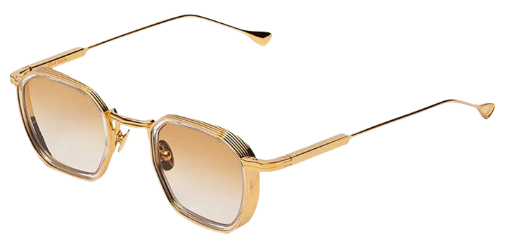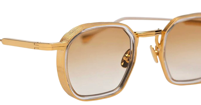 The frame is crafted from a custom alloy, plated with crystal acetate and 22-carat yellow gold, offering a subtle contrast and a refined finish.