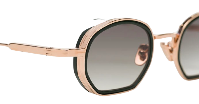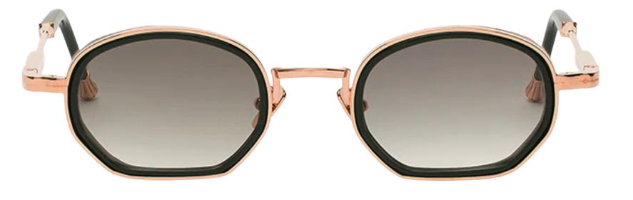 Unisex rectangular frame with a bold design, featuring cut acetate rims enhanced by finely engraved metal detailing with 4 mm striations. The frame is completed with the brand’s new signature temples, finished with engraved John Dalia signature tips. Crafted from Custom Green Racing acetate and a 22-carat rose gold–plated alloy, the frame features an approximately 5-micron plating, with a hallmark stamped inside the temples.