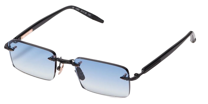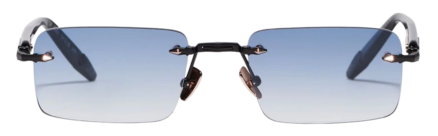 This unisex rimless frame features a modern rectangular shape, highlighted by a wide bridge and finely grooved temples. The elongated acetate temple tips provide enhanced comfort and visual balance.