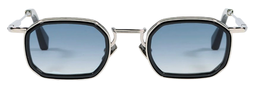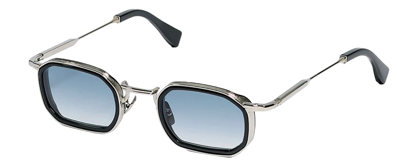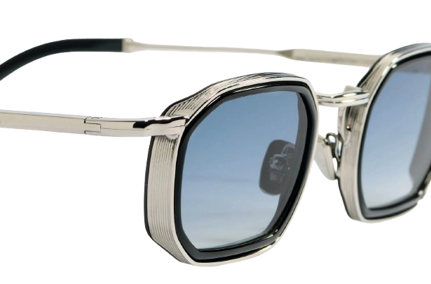 The structure is crafted from a black carbon–treated alloy, combined with glossy silver acetate. The silver plated nose pads feature a discreet hallmark stamped inside the temples, highlighting the level of craftsmanship.