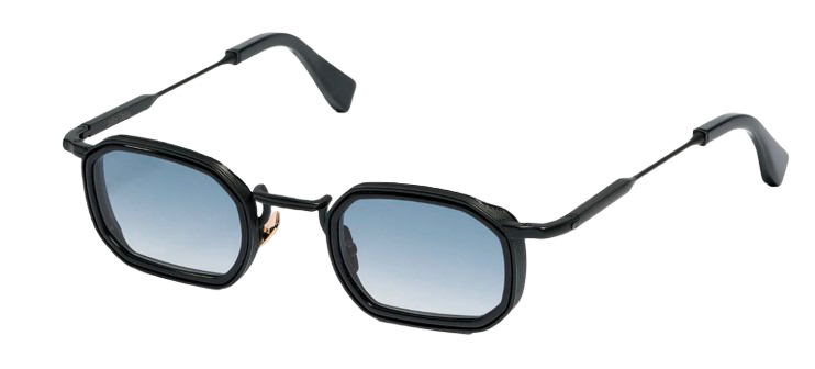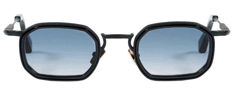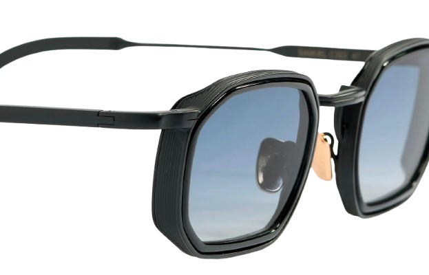 The structure is crafted from a black carbon–treated alloy, combined with glossy black acetate. The rose gold–plated nose pads (approximately 5 microns) feature a discreet hallmark stamped inside the temples, highlighting the level of craftsmanship.